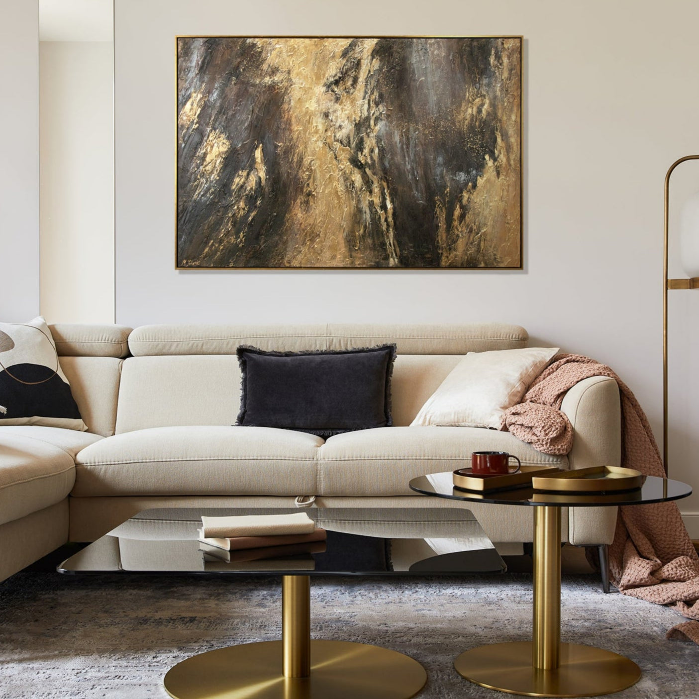 This exclusive hand-painted acrylic painting captivates with a luxurious blend of deep black, gray, and radiant gold accents. The textured surface adds depth and elegance, while the stylish frame makes it perfect for modern living and workspaces.