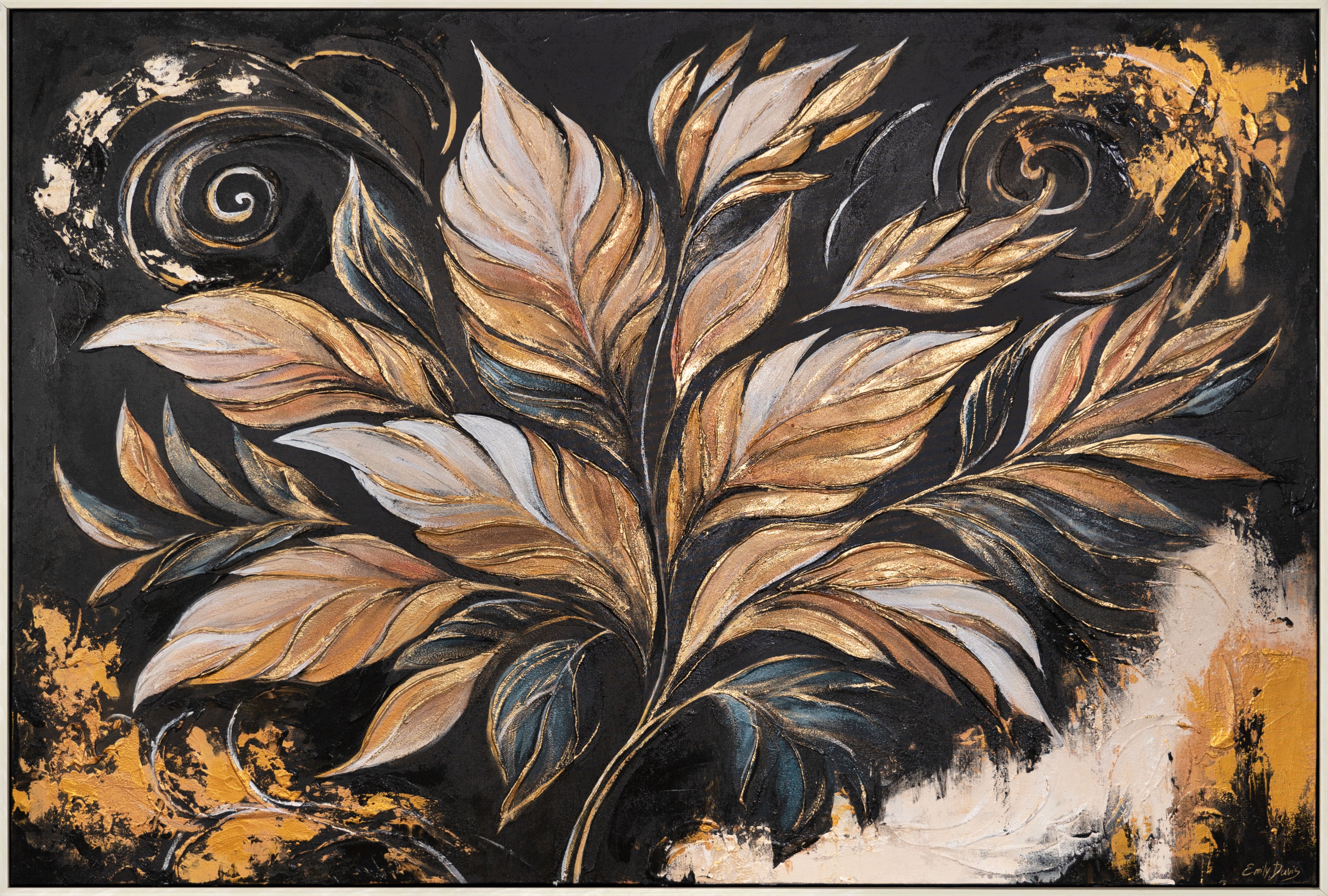 Das handgemalte Acrylbild „Goldene Blätter“ kombiniert elegante Blattmotive mit kräftigen Goldakzenten auf tiefschwarzem Hintergrund. Die dynamischen Formen und glänzenden Texturen verleihen dem Kunstwerk einen luxuriösen Ausdruck.