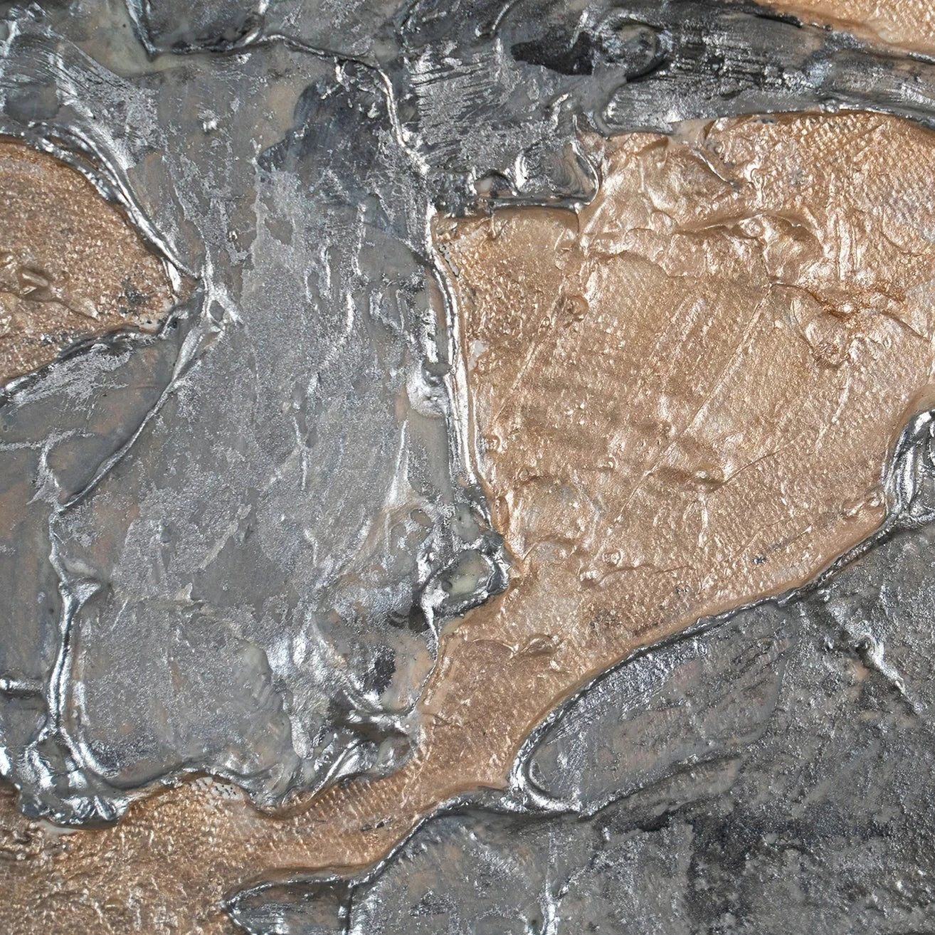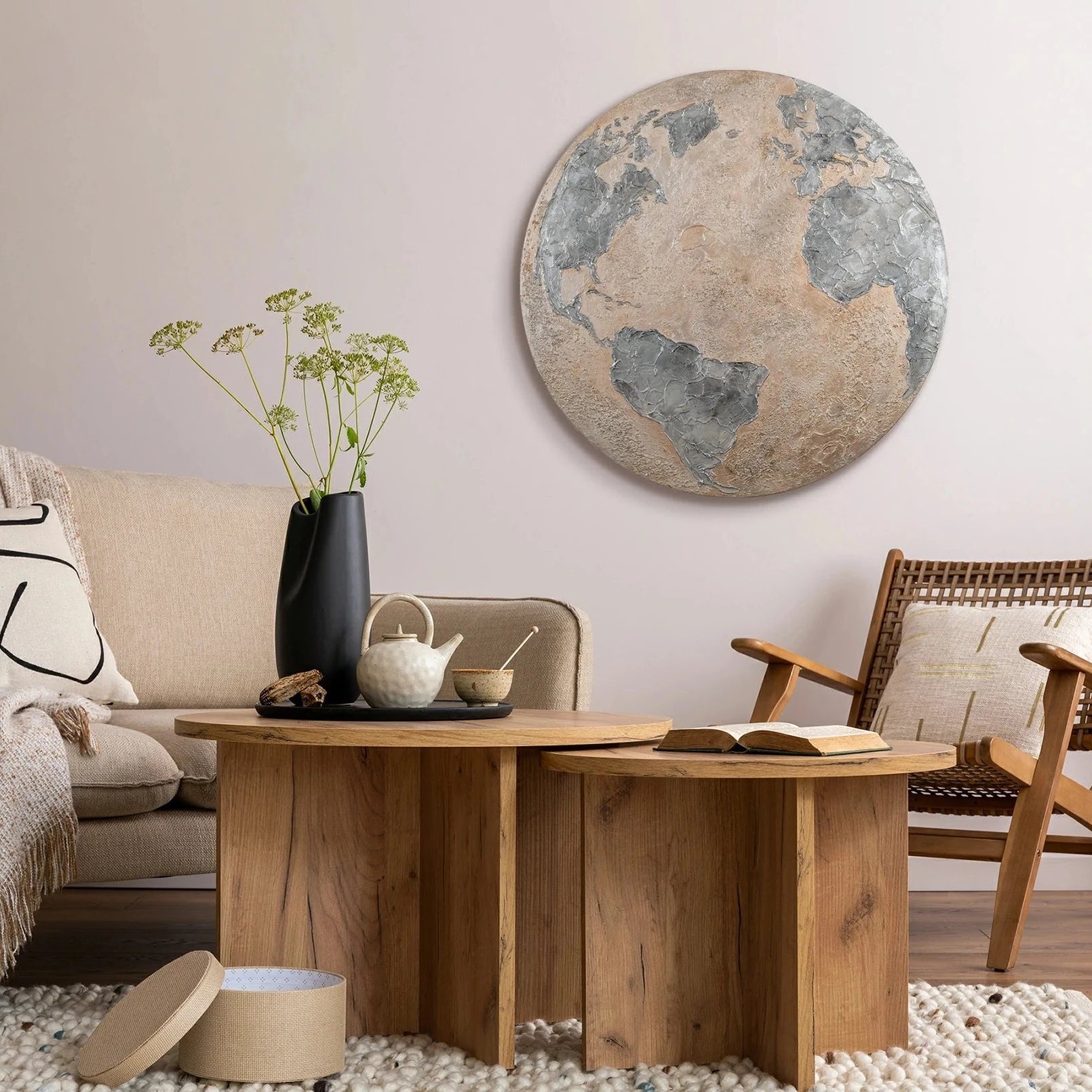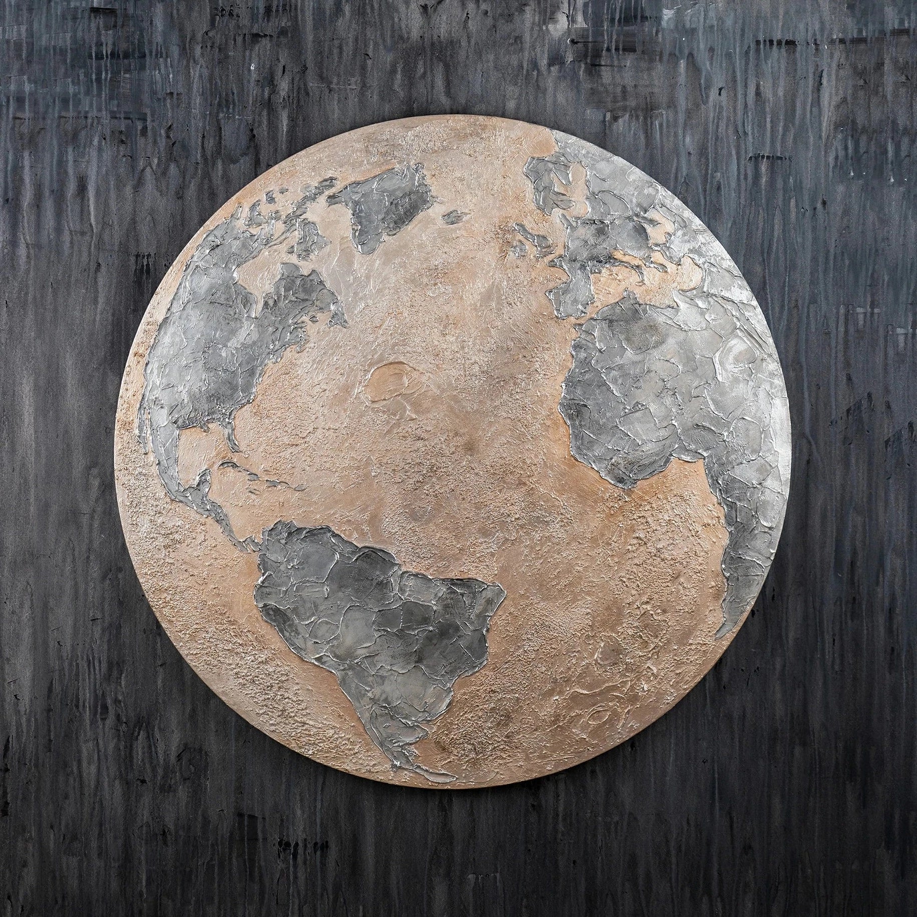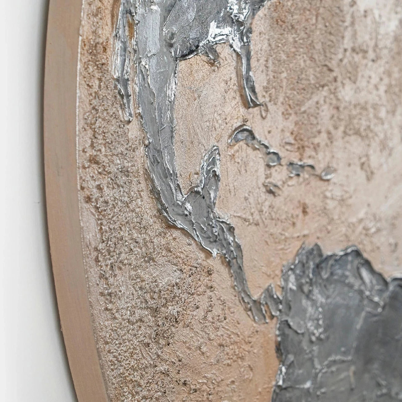 Bereichern Sie Ihr Zuhause oder Büro mit dem eleganten "Silberner Planet" - ein rundes Acryl Gemälde in Form eines Planeten, das in der Dunkelheit dank spezieller Leuchtfarbe strahlt. Diese moderne Kunst besticht durch eine Kombination von silbernen und erdigen Tönen, die eine kühle und zugleich dynamische Atmosphäre schaffen. Das Gemälde ist 100% handgemalt und wird durch einen eleganten Rahmen hervorgehoben.
