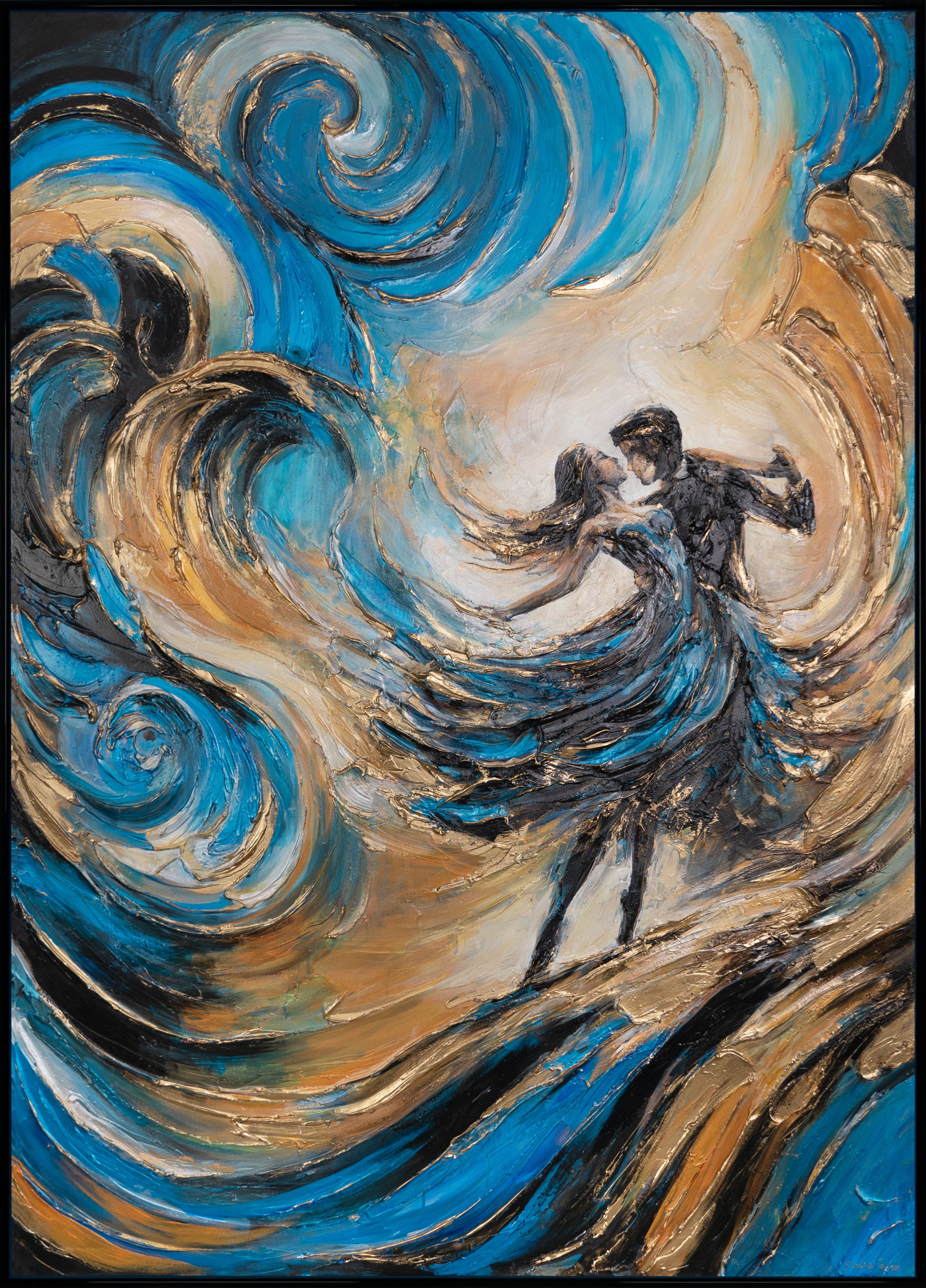 The "Fairy Waltz" canvas painting captures the magic of a dancing moment, masterfully rendered in flowing movements with a vibrant palette of blue, gold, and earthy tones. Dynamic brushstrokes and a richly textured surface give the work an intense depth, drawing the viewer into its spell. This artwork beautifully combines emotion, movement, and artistic finesse.