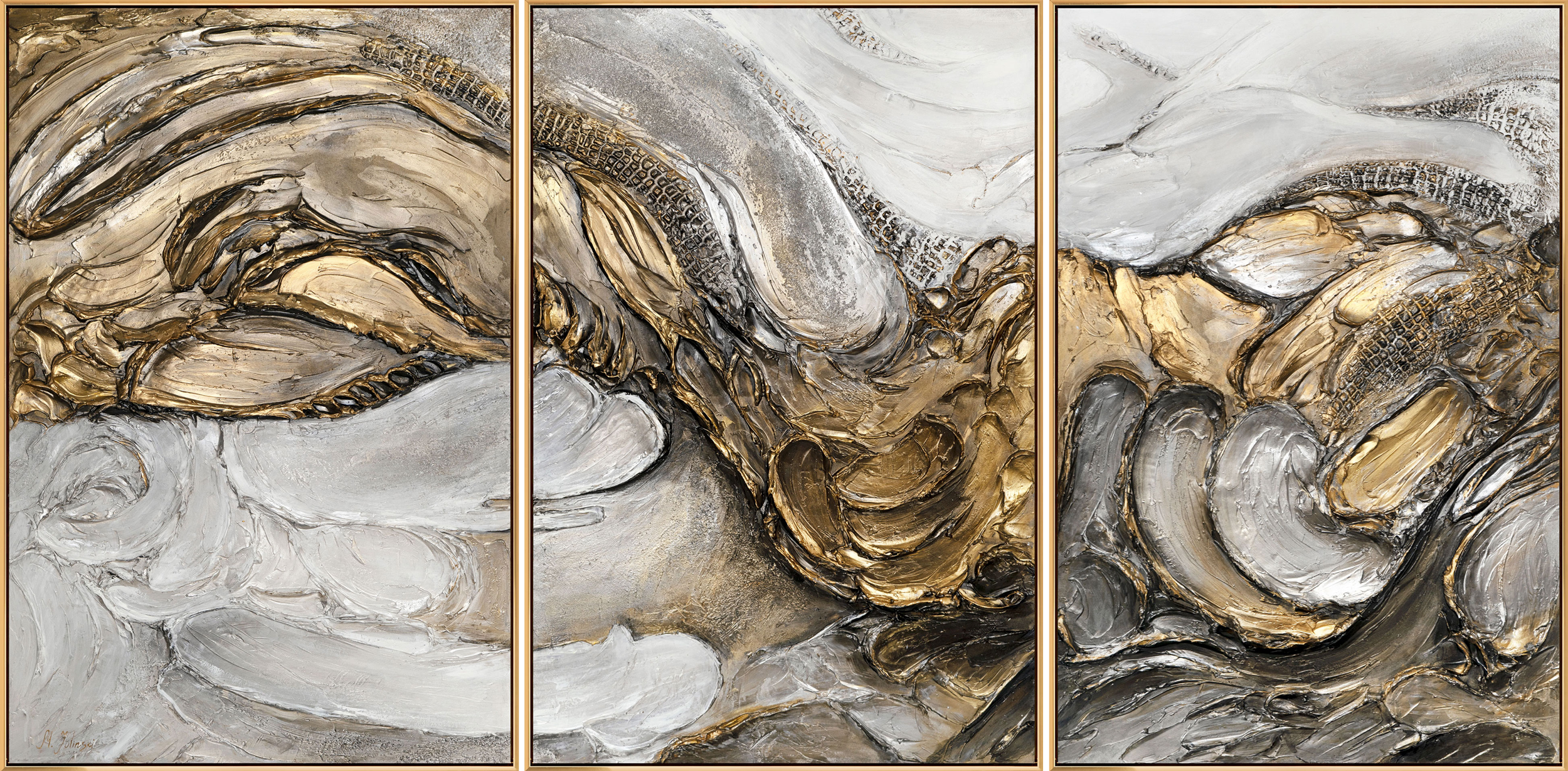 The "Tsunami" triptych impresses with its powerful, abstract composition featuring dynamic shapes in soft white, gray, and gold tones. This large hand-painted canvas masterfully combines texture and color to evoke the energy of a mighty natural force. The textured surface and harmonious color palette make this triptych a unique artwork for modern living and commercial spaces.