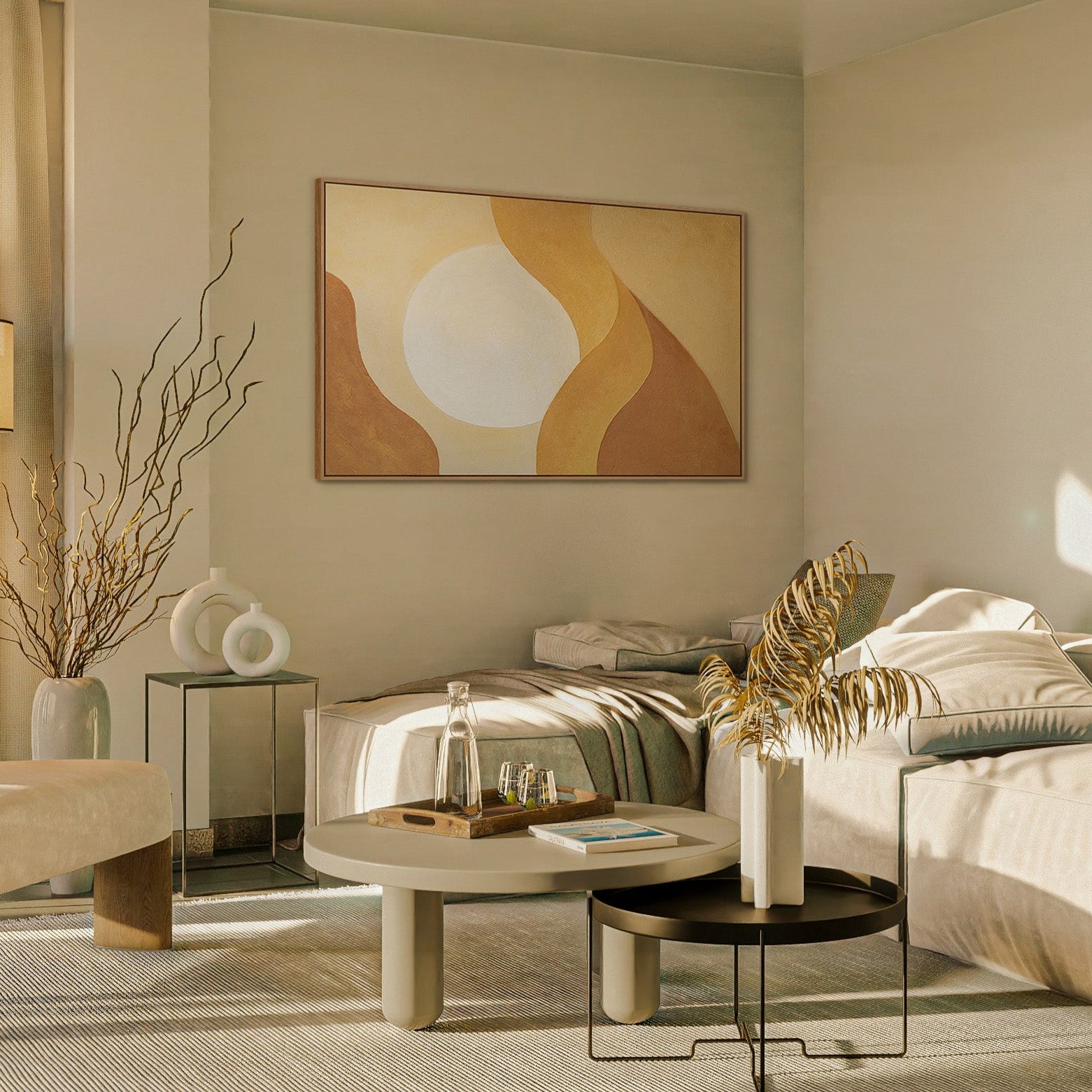 "Embrace of Dawn" represents peace, light, and balance. The abstract painting brings warmth to the room and supports a clean, modern living experience with timeless elegance.